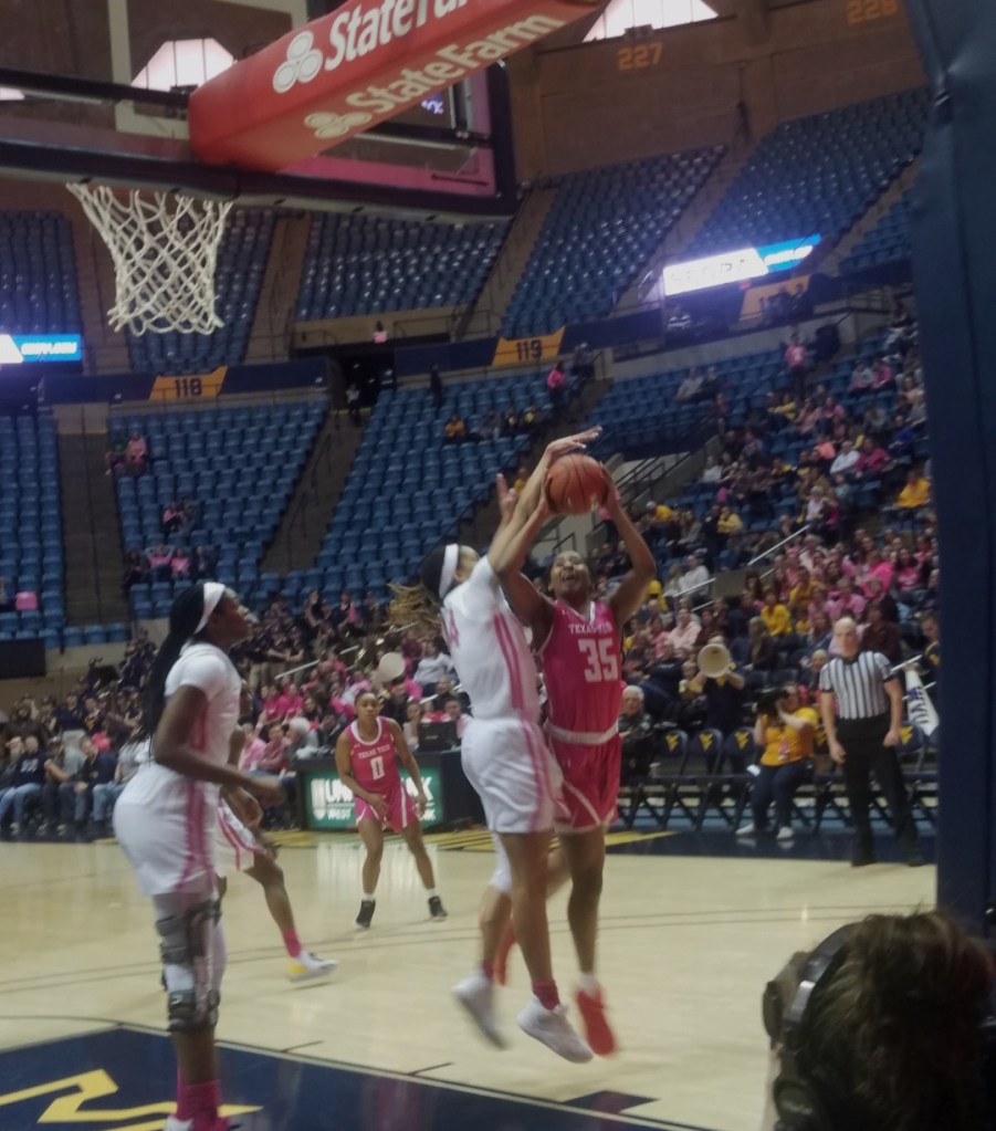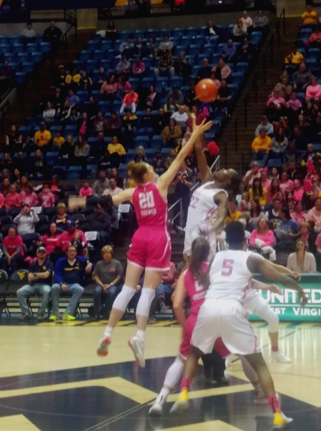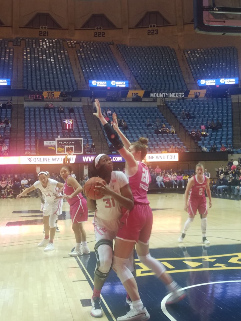 WVU’s Rochelle Norris (with ball) sizes up Texas Tech’s Brittney Brewer close to the basket.