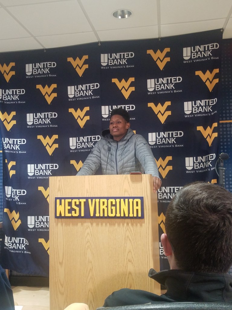 Mountaineer guard Tynice Martin address the media after beating Texas Tech. Martin had 20 points to lead all scorers.