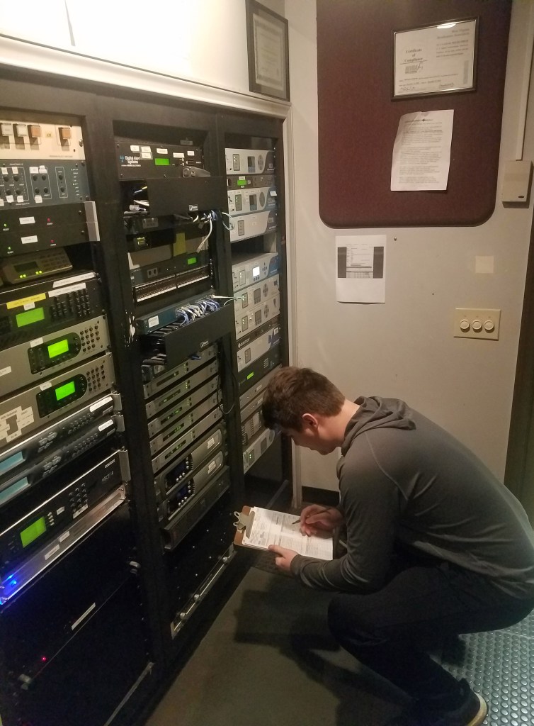 Ethan Collins, WAJR employee, takes transmitter readings for the WAJR 5,000 watt transmitter.